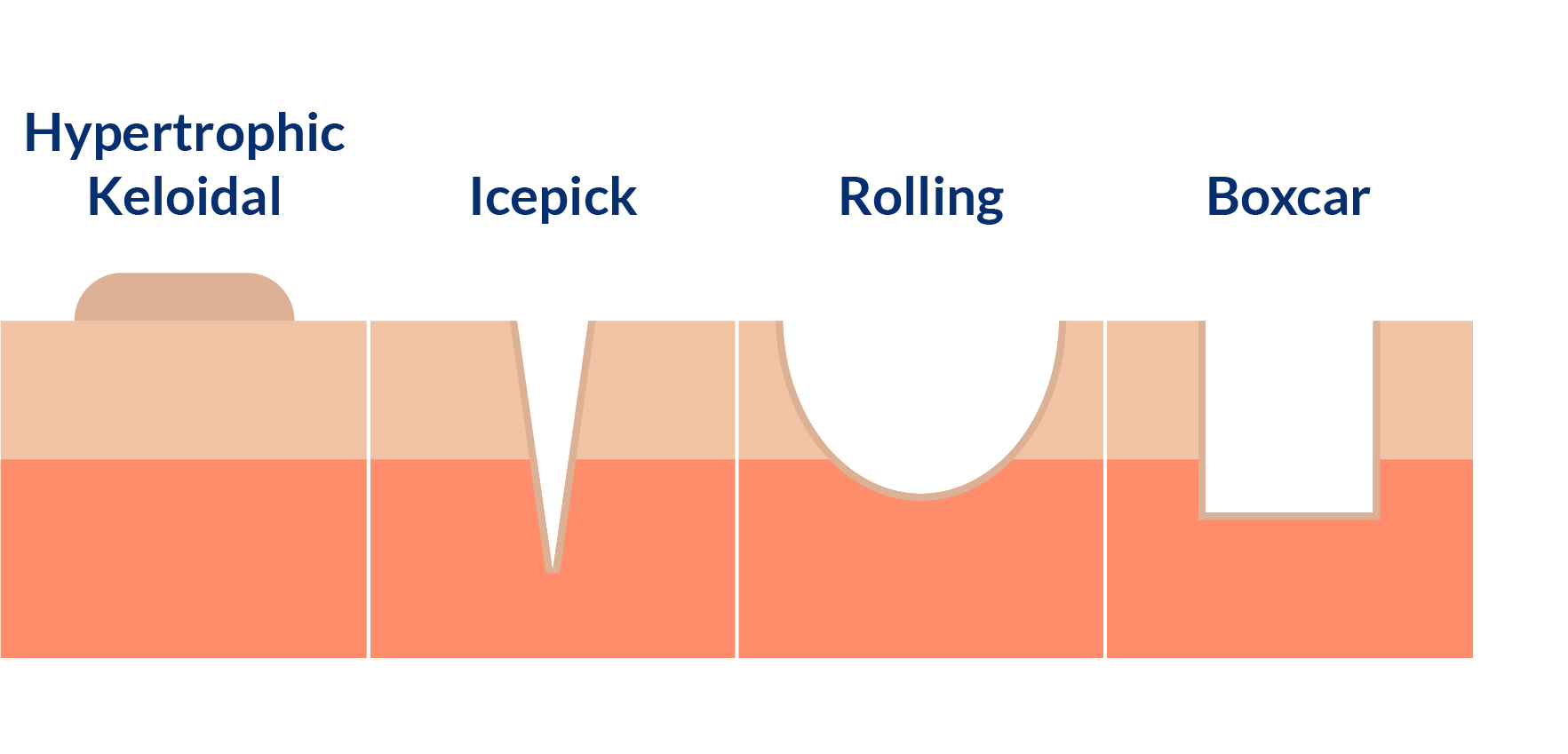Atrophic scars - the most common scars resulting from acne (~85%) - are characterized by collagen loss, resulting in skin depression. This category is even subdivided into ice-pick, boxcar and rolling scars. Although less frequent, keloid and hypertrophic scars may also occur as a result of collagen gain, originating raised scars within (hypertrophic) or beyond (keloid) the original borders.